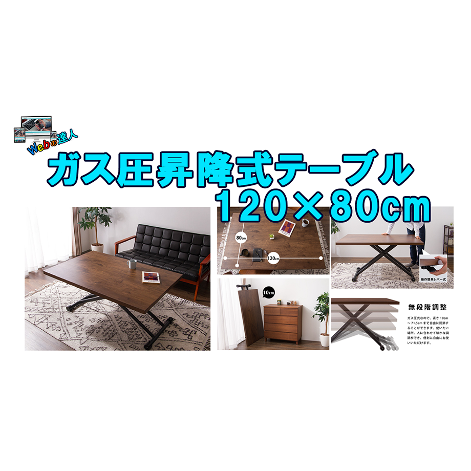 ガス圧昇降式テーブル 120cm×80cm値段に対してものすごくお得なテーブルです。高さ調整も10cm~71.5cmまで調整でき、床、ソファ、いすに座っての作業すべてに対応できます。しっかりしていて満足度100%、縦に折りたためるので収納にも場所を取らず便利です。